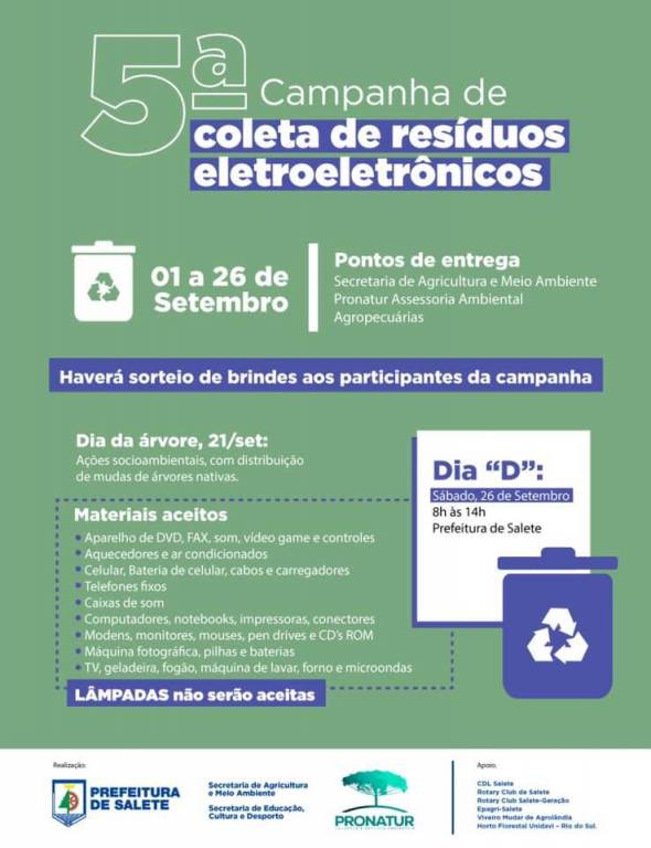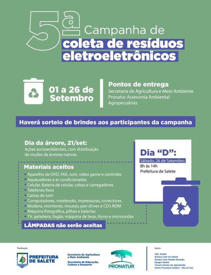 O dia “D” da Campanha de Coleta de Resíduos Eletroeletrônicos irá acontecer no dia 26 de Setembro, das 8:00 á 14 horas na Prefeitura de Salete.
